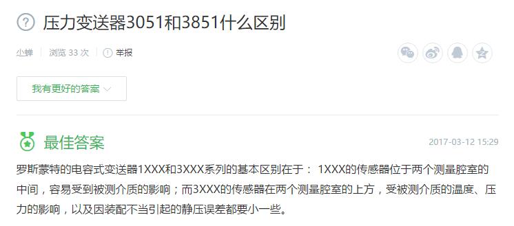 羅斯蒙特的電容式變送器1XXX和3XXX系列的基本區別在于: 1XXX的傳感器位于兩個測量腔室的中間,容易受到被測介質的影響;而3XXX的傳感器在兩個測量腔室的上方,受被測介質的溫度、壓力的影響,以及因裝配不當引起的靜壓誤差都要小一些。
