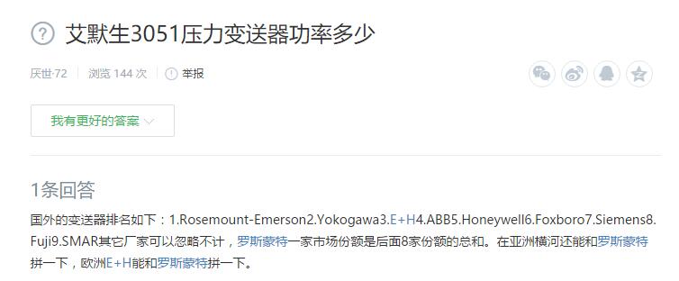 國外的變送器排名如下:1.Rosemount-Emerson2.Yokogawa3.E+H4.ABB5.Honeywell6.Foxboro7.Siemens8.Fuji9.SMAR其它廠家可以忽略不計,羅斯蒙特一家市場份額是后面8家份額的總和。在亞洲橫河還能和羅斯蒙特拼一下,歐洲E+H能和羅斯蒙特拼一下。