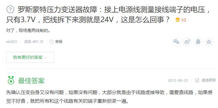 4、羅斯蒙特壓力變送器故障:接上電源線測量接線端子的電壓,只有3.7V,把線拆下來測就是24V,這是怎么回事?(對了,現場是兩線制的。)