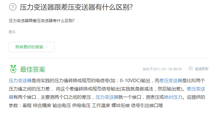 壓力變送器測量單個(容器)氣體或液體的壓力的大小,并且是一個絕對量。