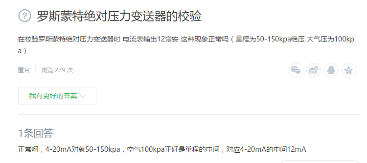 2、羅斯蒙特絕對壓力變送器的校驗(在校驗羅斯蒙特絕對壓力變送器時 電流表輸出12毫安 這種現象正常嗎(量程為50-150kpa絕壓 大氣壓為100kpa))